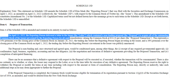 根据一份提交到美国证券交易委员会的文件,马斯克已经在美国时间昨天4月13日 Twitter 董事会发起了收购要约,想要以每股54美元的价格全资收购 Twitter ,并且将公司私有化。