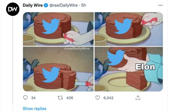 马斯克今天的恶意收购行为,让这张图看起来更像是现实,而不是梗图 来源:Daily Wire