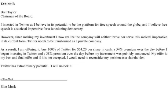 马斯克决定以$54.2的价格收购这家公司的全部股份,预计共将花费430亿美元。此价格,相比马斯克之前开始低调收购 Twitter 股份时的溢价率高达54%,相比之前收购股份结果正式公布时的股价也提高了38%。马斯克认为这次全资接管,以及$54的价格,对于公司董事会和其他投资者来说都是最好的结果,“这是我的最终报价,如果不被接受,我将重新评估作为股东的身份。”