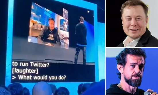 马斯克和 Dorsey 据传关系非常好,但是二人还真没怎么同框过。上图为 Twitter 公司之前的一次大会上二人视频连线对话 图片来源:Daily Mail