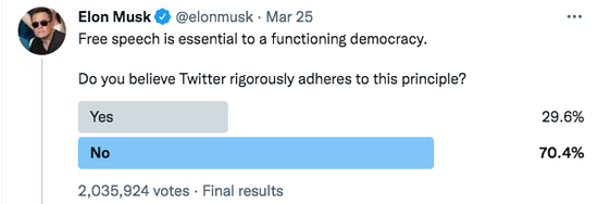 3月25日,他在自己账号上发布一项投票,询问粉丝:请投票,你觉得 Twitter 有遵守“Free Speech”的原则吗?结果,有超过200万投票者参与,七成认为 Twitter 在这一点上不合格: