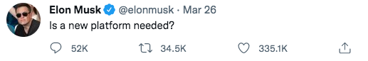 在那之前,马斯克的种种公开发言都预示过他想要做些跟社交网络有关的事情。所以在他发了下面这条推文之后,很多人都一度以为他要创业了: