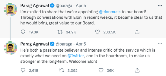 Twitter CEO Parag Agrawal 在自己的个人账号上恭喜了马斯克加入公司,并且邀请他加入公司董事会。