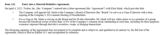 外界没有人知道马斯克所说的“重新评估作为股东的身份”这句话是什么意思。不过在另一份递交到 SEC 的文件中,记录了马斯克和Twitter 董事长 Bret Taylor 之间的一通电话内容。