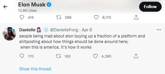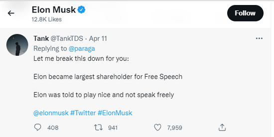 这最后一句话可太有意思了:“我相信这是最好的结果”——对谁是最好的结果?肯定不是马斯克,毕竟对于 Twitter,他早就满腹埋怨了,早就想有一票属于自己话语权了,要不然他也不会突然增持股票,以及今天突然对公司发起全资收购嘛。