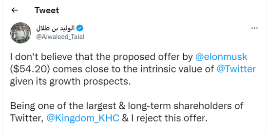 同样在今天,公司的长期投资人,沙特王子 Alwaleed bin Talal 也通过自己的 Twitter 账号发声,表示考虑到 Twitter 的长期前景,马斯克给出的$54美元价格的收购要约,并不符公司的“内在价值”(intrinsic value)。并且,他和他所代表的沙特王室控股公司 KHC 直接拒绝了马斯克的这次收购要约。