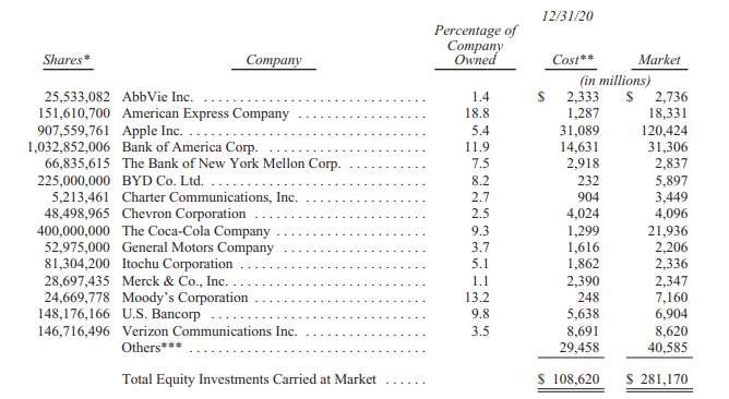 伯克希尔哈撒韦公布的截至去年底的前十大重仓股: