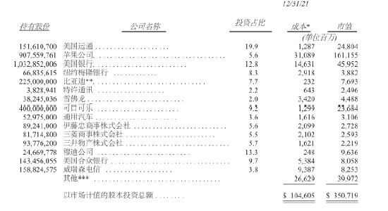 苹果,按年底市值计算,是我们的亚军,是我们另一种类型的持仓。在这里,我们的持股比例仅为5.55%,高于一年前的5.39%。这个增幅听起来像是小菜一碟。但考虑到苹果2021年的收益中,每0.1%的持股都是1亿美元。我们并没有花费伯克希尔的资金进行增持,苹果的回购起了作用。