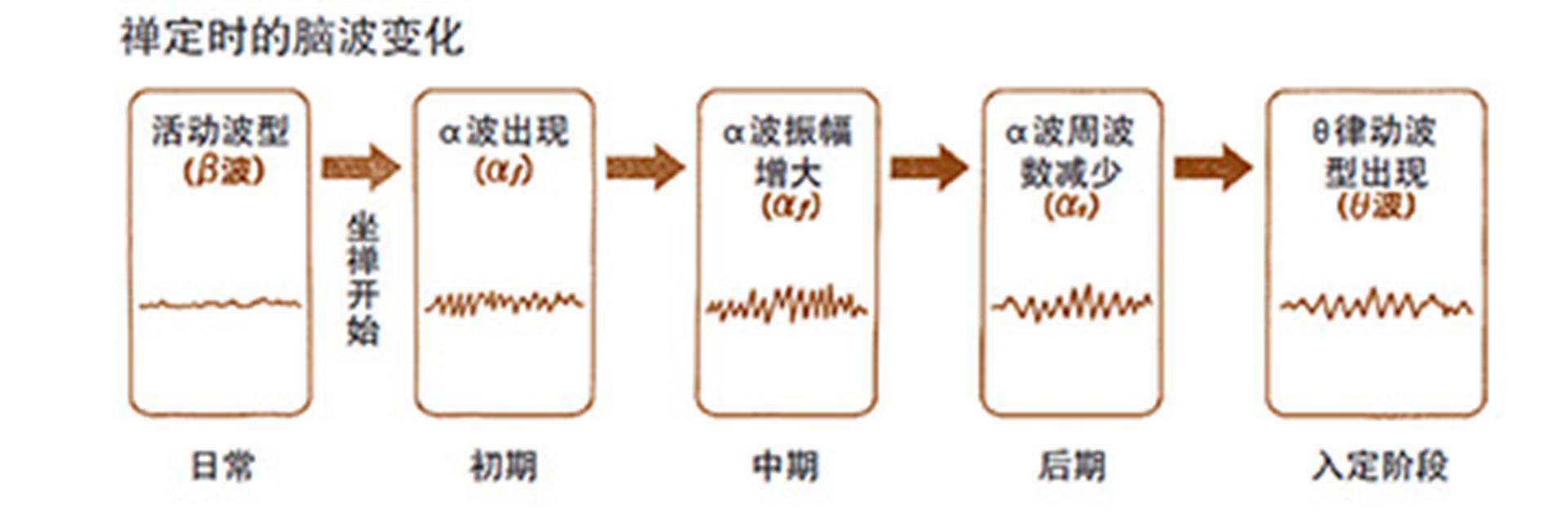 “高僧修禅入三昧境界时,大脑前叶的α脑波特别强,而修禅初期的人,那里几乎测不出α脑波。此外,在修禅初期的人打瞌睡时,却能测出大脑前叶发出θ脑波,而在戒板打到肩上(坐禅时出现瞌睡或坐姿不稳等状况时,师父就会用戒板敲打,谓之棒喝)的瞬间,θ脑波消失,代之以β脑波。”