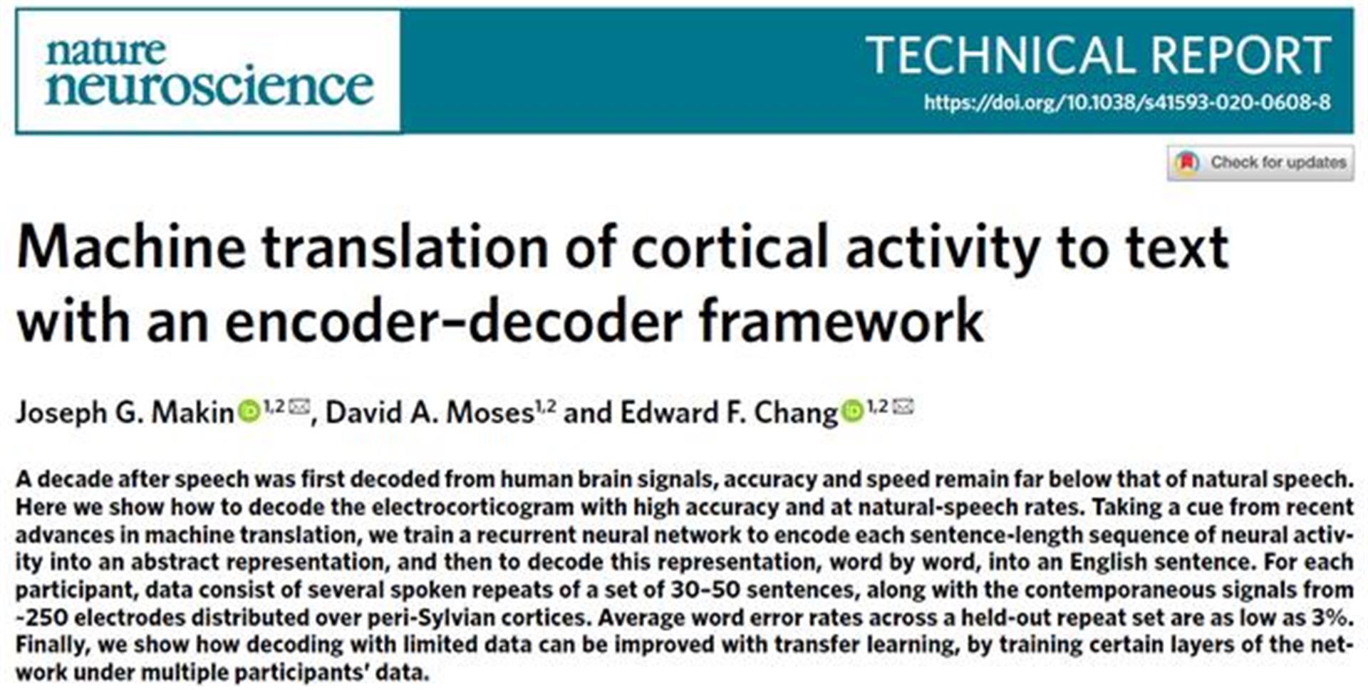 研究人员表示,这项研究展示了以高精度和自然语速来解码皮层脑电图。在对其中一个志愿者的脑电波解码任务中,平均每句话只有3%需要纠正——胜过专业人工速记员平均5%的错误率。